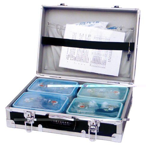 该箱采用的方法是将各种腐蚀性化学试剂分别封装在安培瓶里。再将安培瓶封装在塑料套内。使用时将安培瓶打碎使试剂混合,用剪刀剪开塑料管封口,溶液从开口流出,点注在潜在金属字迹上,将潜在金属字迹显出。
